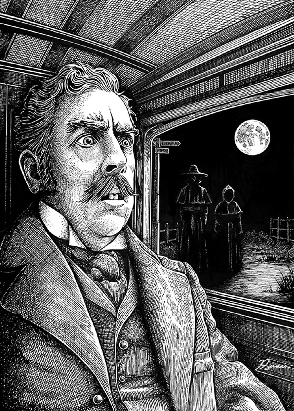 At the corner two figures were standing motionless; both were in dark cloaks; the taller one wore a hat, the shorter a hood. He had no time to see their faces, nor did they make any motion that he could discern.